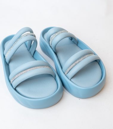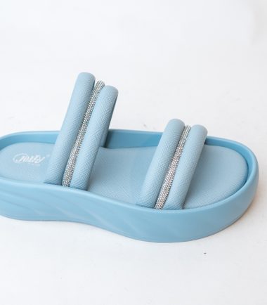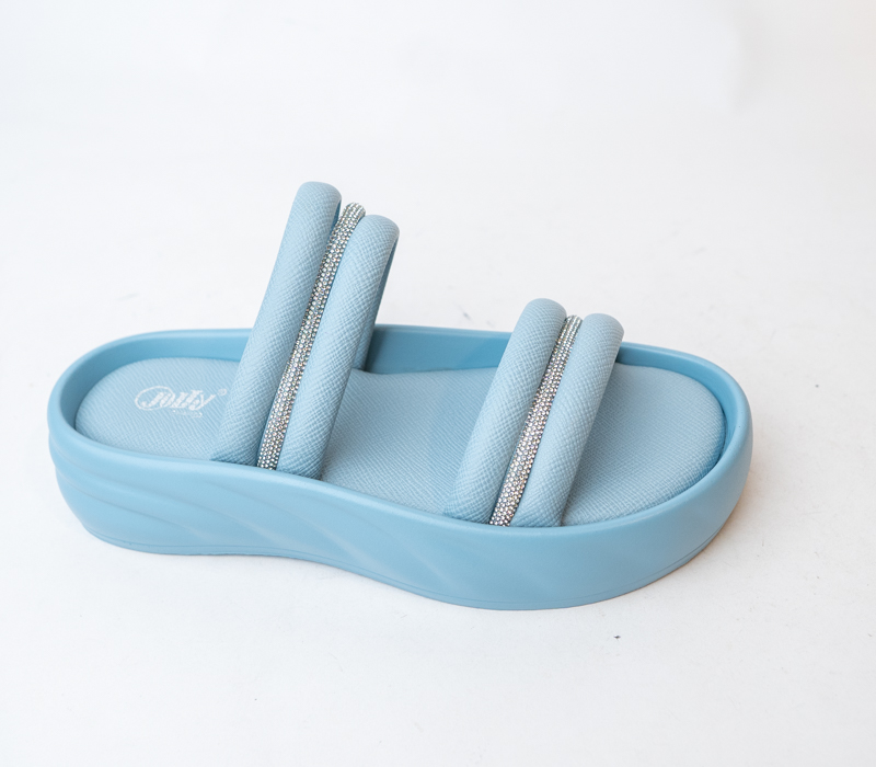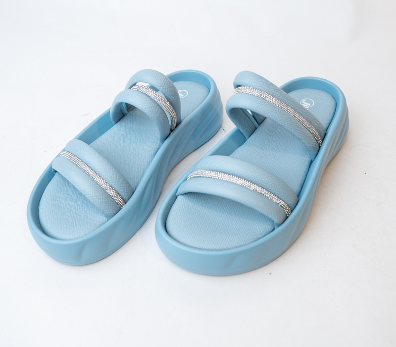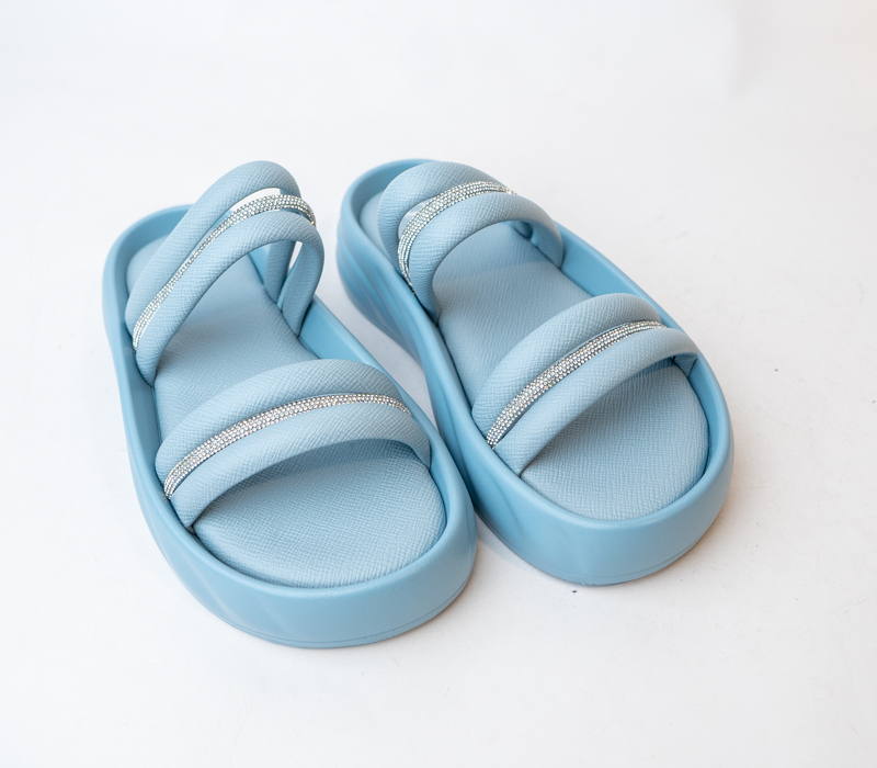 Add a touch of sparkle to your summer wardrobe with these flat open-toe slippers featuring a dazzling upper. Perfect for casual outings or evening chic. These slippers have rounded toe with padded footbed.