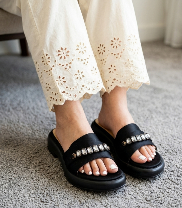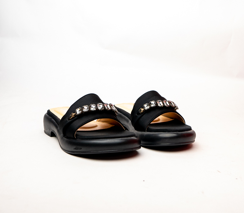 Add a touch of sparkle to your summer wardrobe with these flat open-toe slippers featuring a dazzling upper. Perfect for casual outings or evening chic. These slippers have rounded toe with padded footbed.