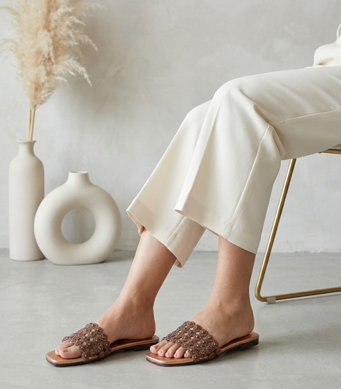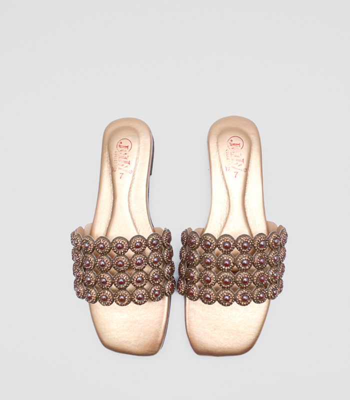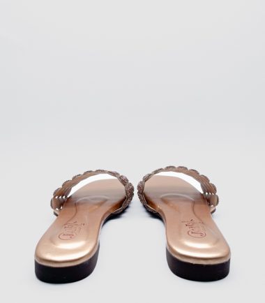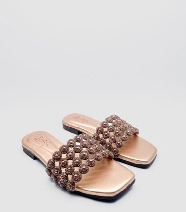 Add a touch of sparkle to your summer wardrobe with these flat open-toe slippers featuring a dazzling upper. Perfect for casual outings or evening chic. These slippers have rounded toe with padded footbed.