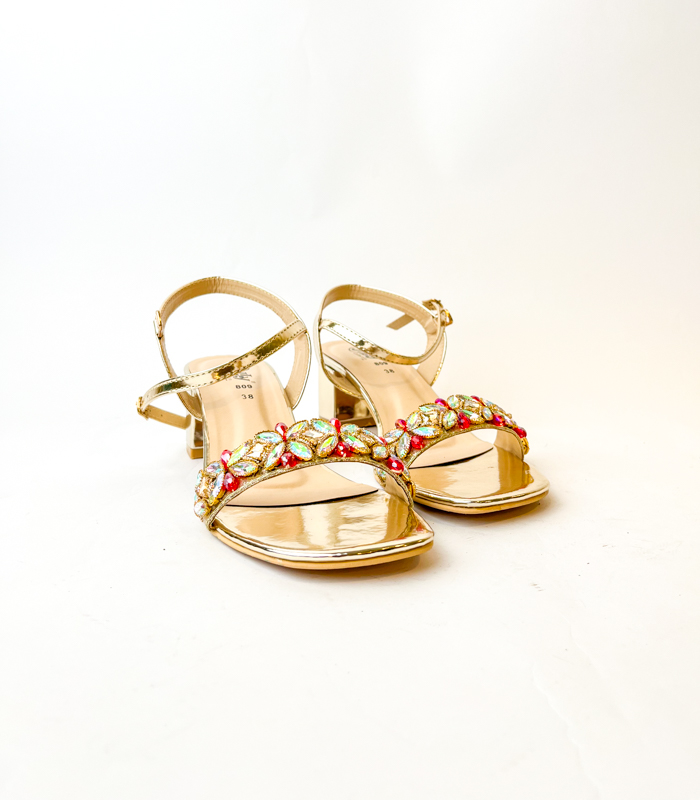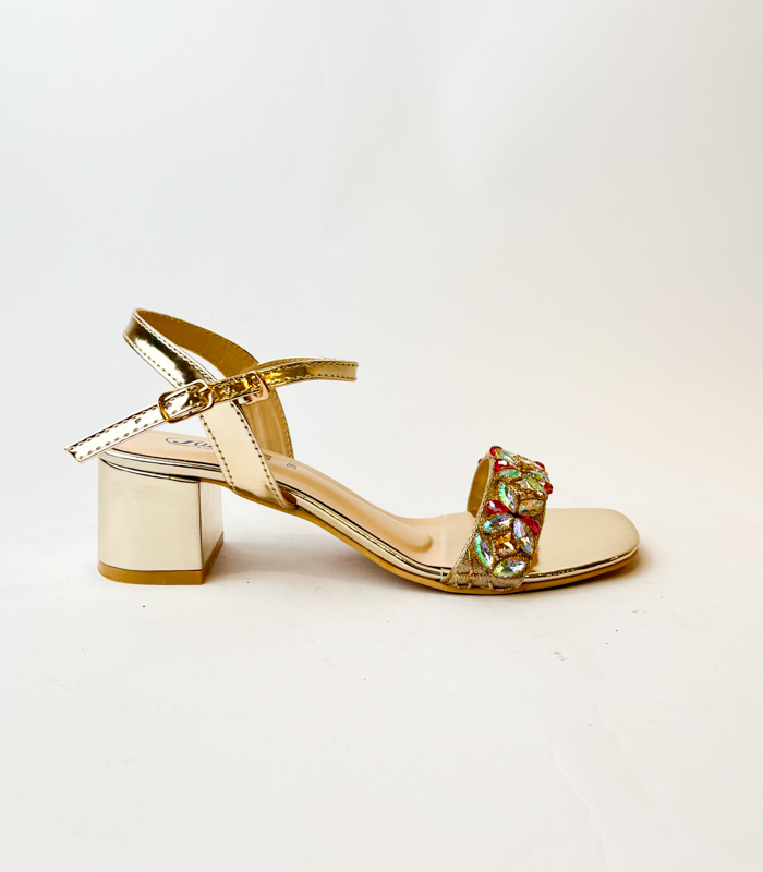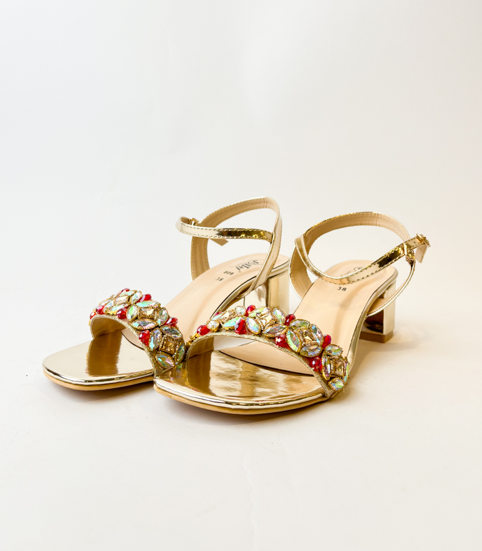 Add a touch of sparkle to your wardrobe with these sandals featuring a dazzling upper. Perfect for casual outings or evening chic. These sandals have rounded toe with padded footbed.
