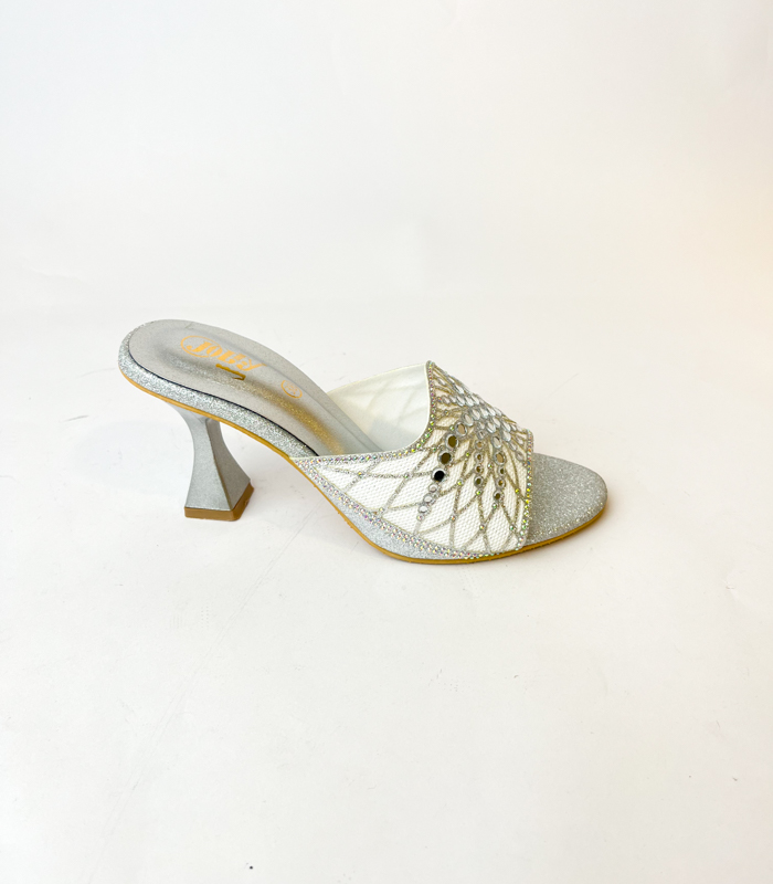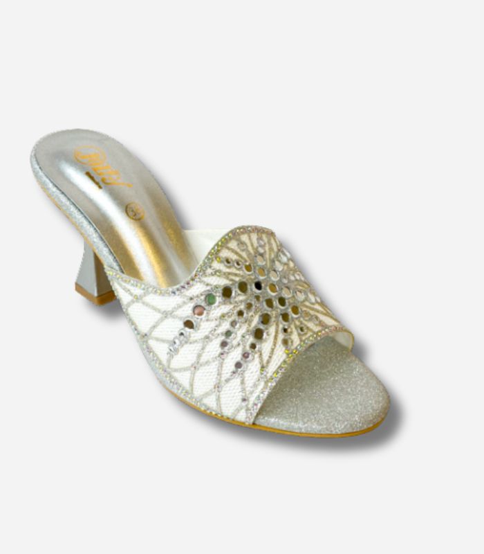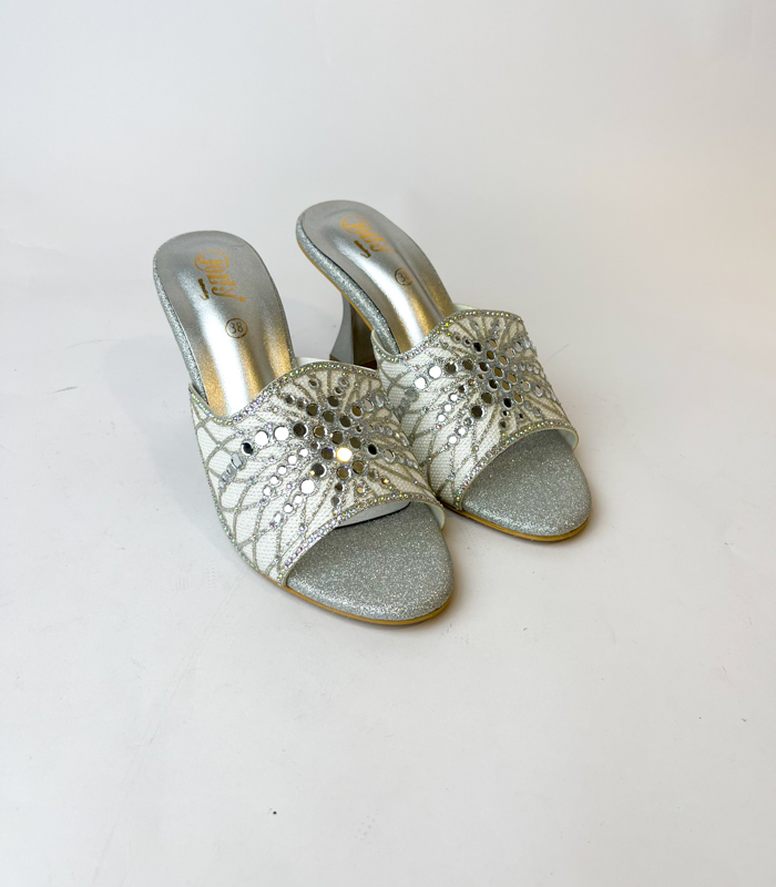 Add a touch of sparkle to your summer wardrobe with these flat open-toe slippers featuring a dazzling upper. Perfect for casual outings or evening chic. These slippers have rounded toe with padded footbed.