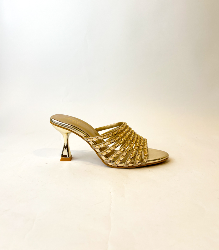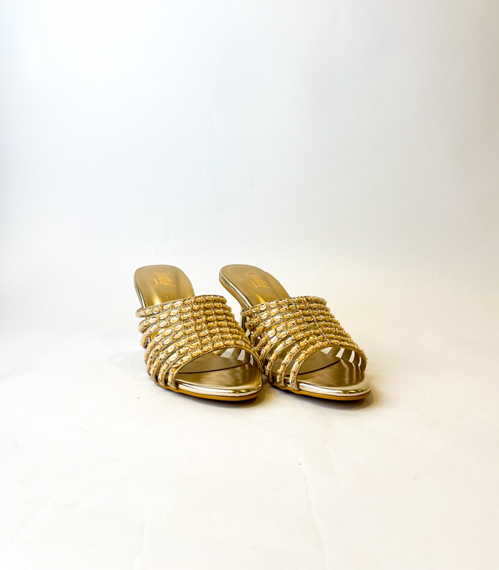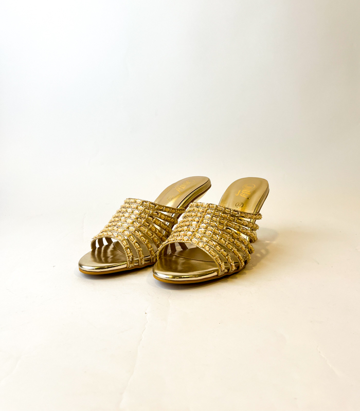 Add a touch of sparkle to your summer wardrobe with these flat open-toe slippers featuring a dazzling upper. Perfect for casual outings or evening chic. These slippers have rounded toe with padded footbed.