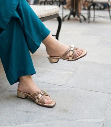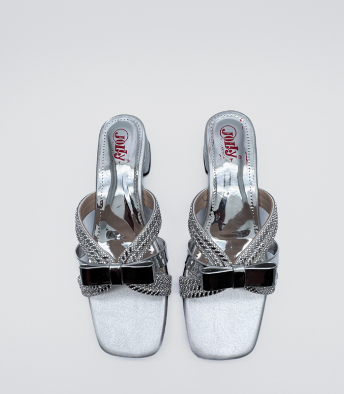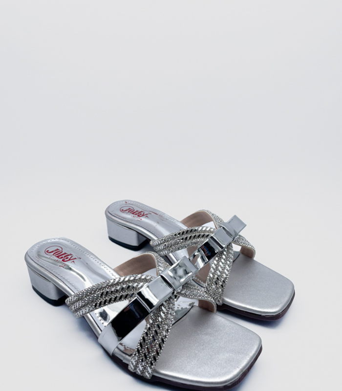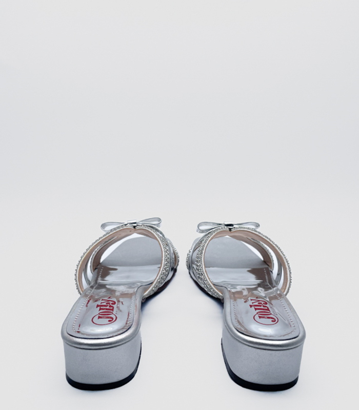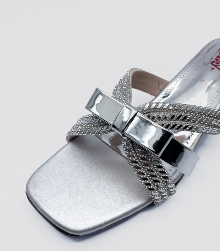 Add a touch of sparkle to your summer wardrobe with these flat open-toe slippers featuring a dazzling upper. Perfect for casual outings or evening chic. These slippers have rounded toe with padded footbed.